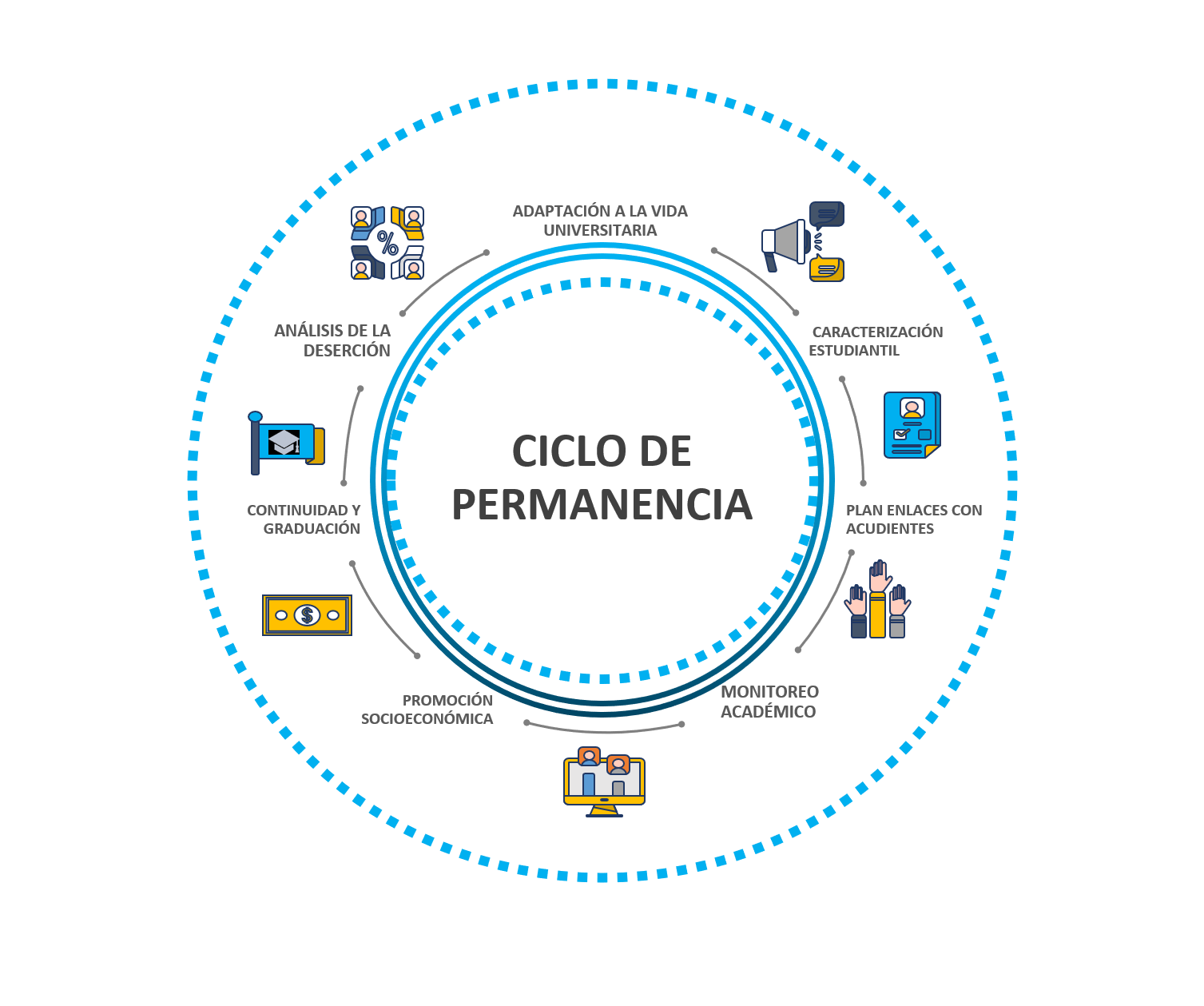 La permanencia y graduación estudiantil, se constituyen como eje fundamental de las políticas y procesos de la Fundación Universitaria Antonio de Arévalo. En este sentido, todas las Áreas institucionales son corresponsables del objetivo de disminuir los niveles de deserción en la institución, mediante la implementación de un programa integral que contiene las estrategias de intervención pertinentes para cada etapa del ciclo del estudiante; desde su ingreso hasta su graduación.