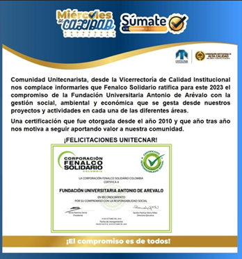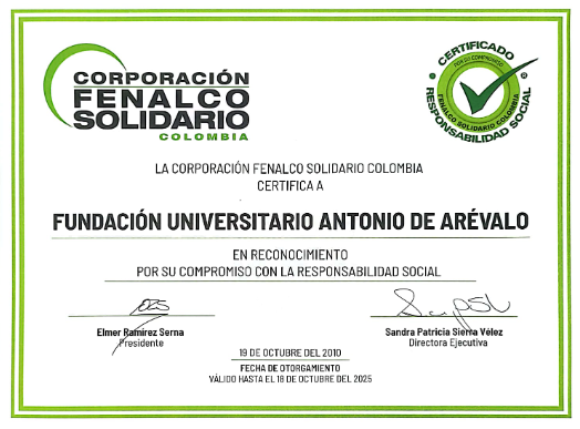 En cumplimiento de nuestro compromiso con la transparencia, la participación y la mejora continua, la universidad cuenta con el certificado ISO 9001:2015, que respalda la calidad de sus procesos. También ha sido reconocida por la Fundación Fenalco Solidario Colombia por sus prácticas responsables en lo económico, social y ambiental.