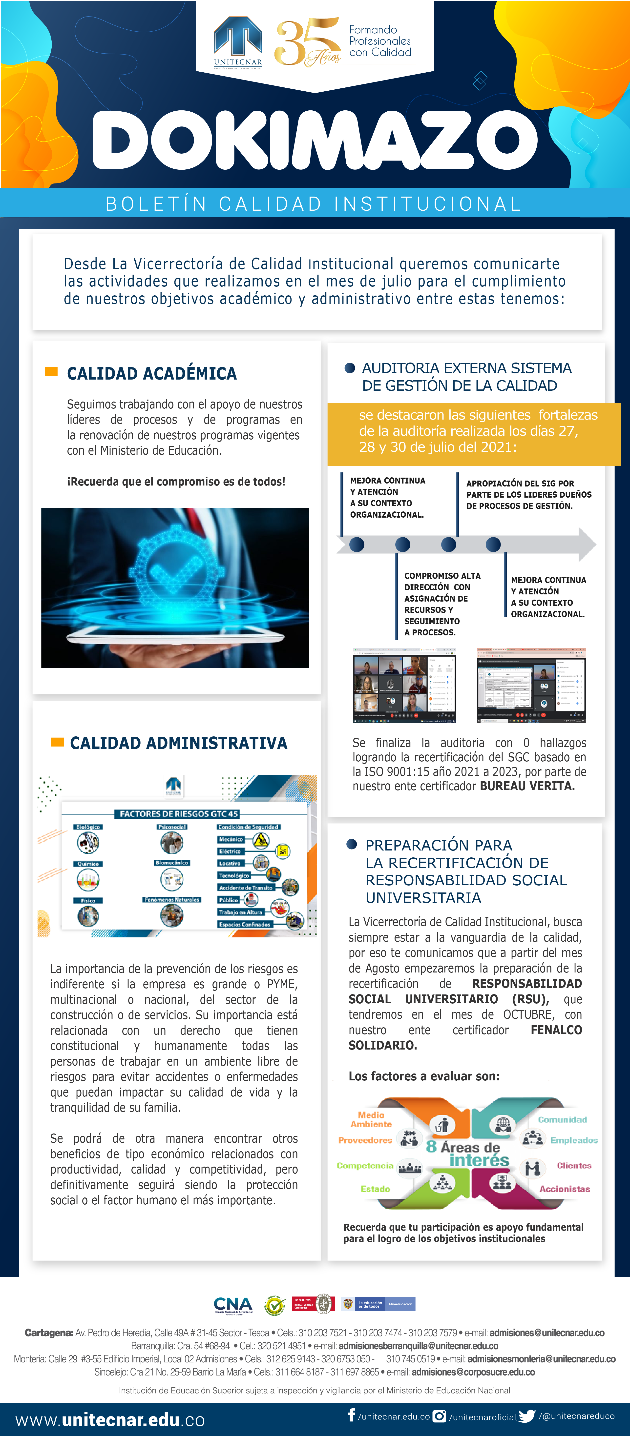 Desde Calidad Administrativa, nos complace informarles que durante los días 24, 25 y 26 de junio, recibimos la Auditoría Externa del Sistema Gestión de Calidad (SGC), según los lineamientos de la ISO 9001: 2015. Con los siguientes resultados: