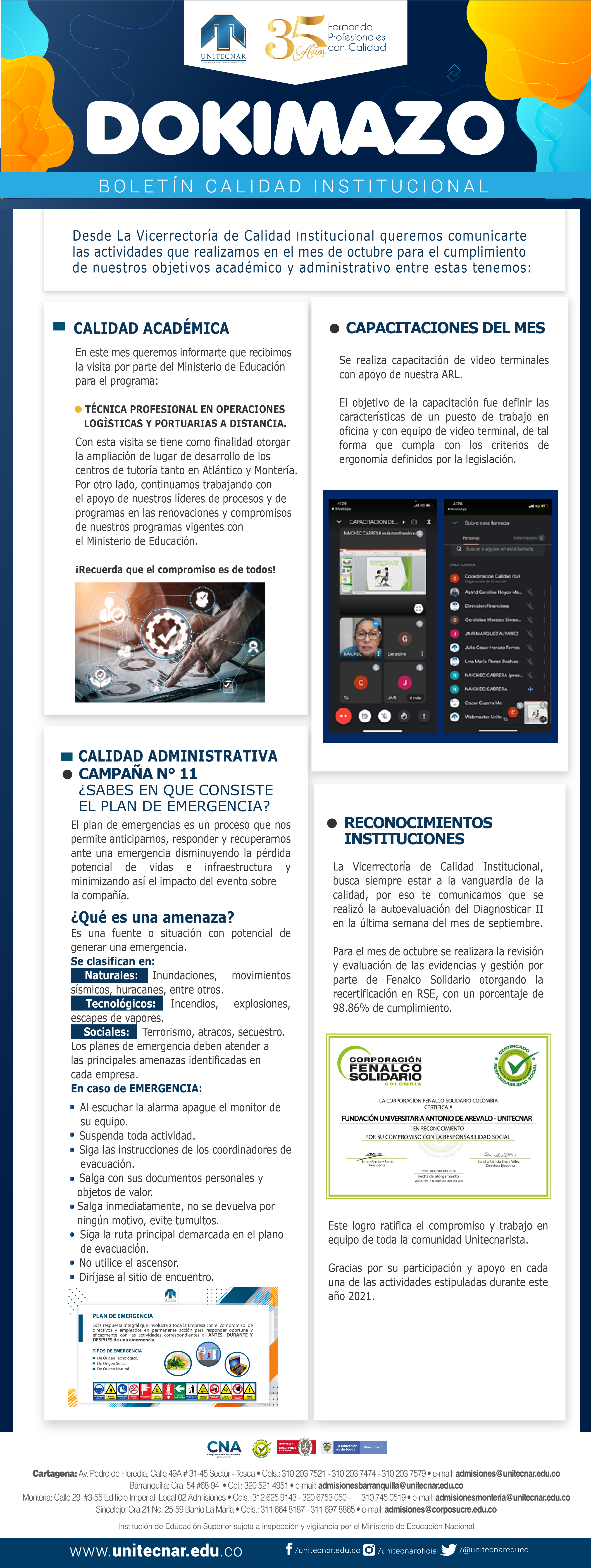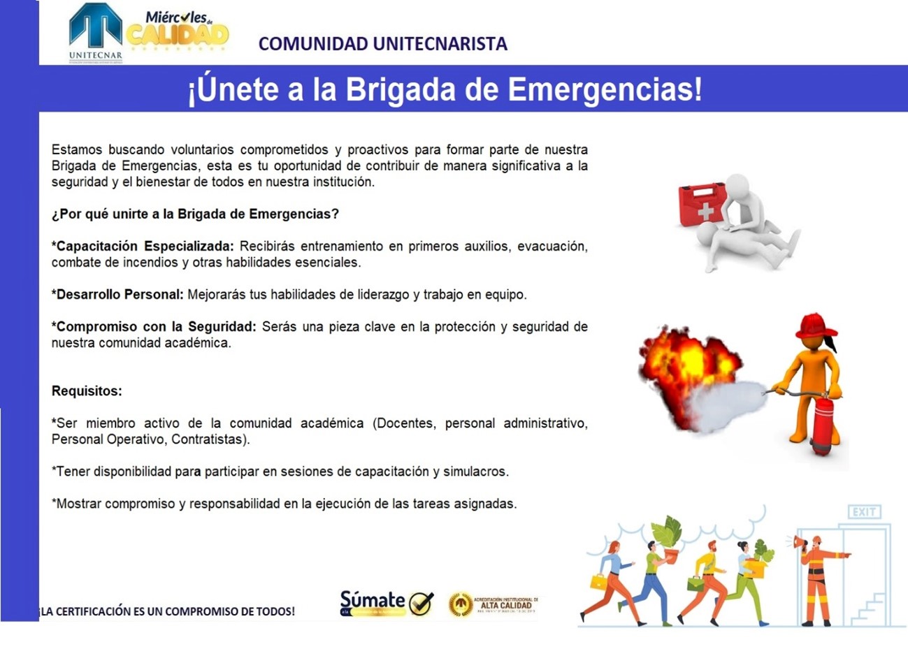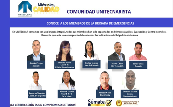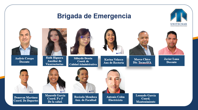 Con base a lo anterior Unitecnar cuenta con su plan de emergencia y brigadistas, los cuales, están capacitados y formados para atender la primera línea de la emergencia.