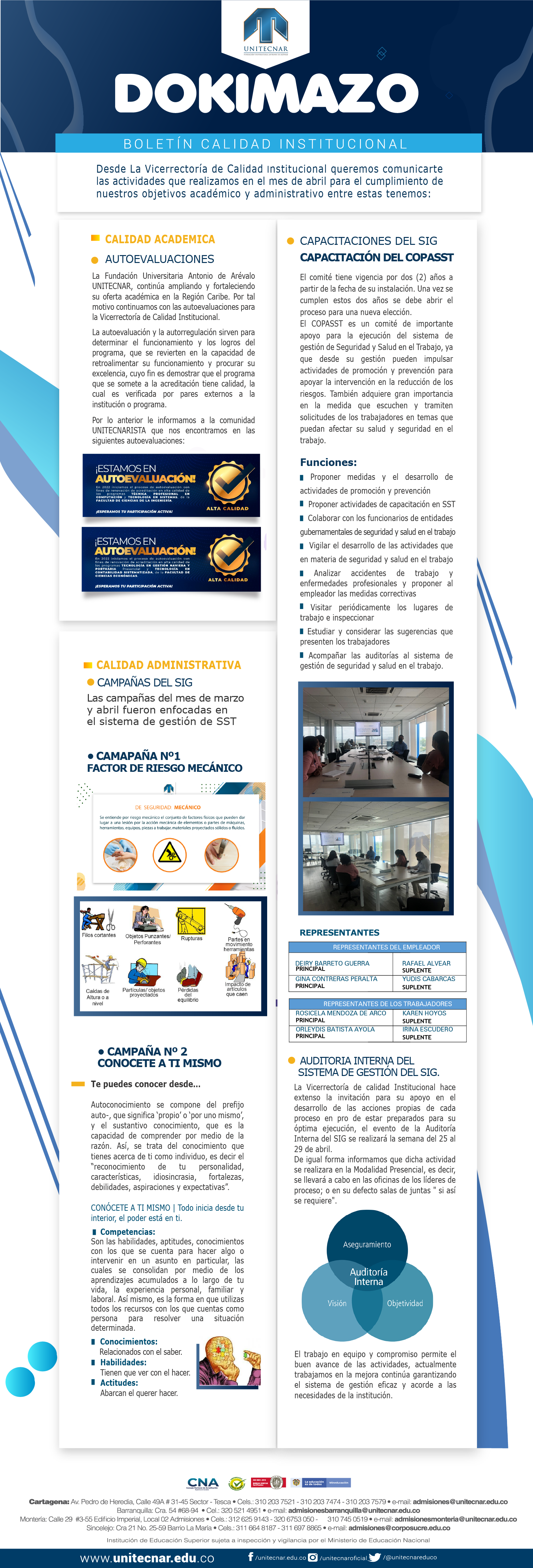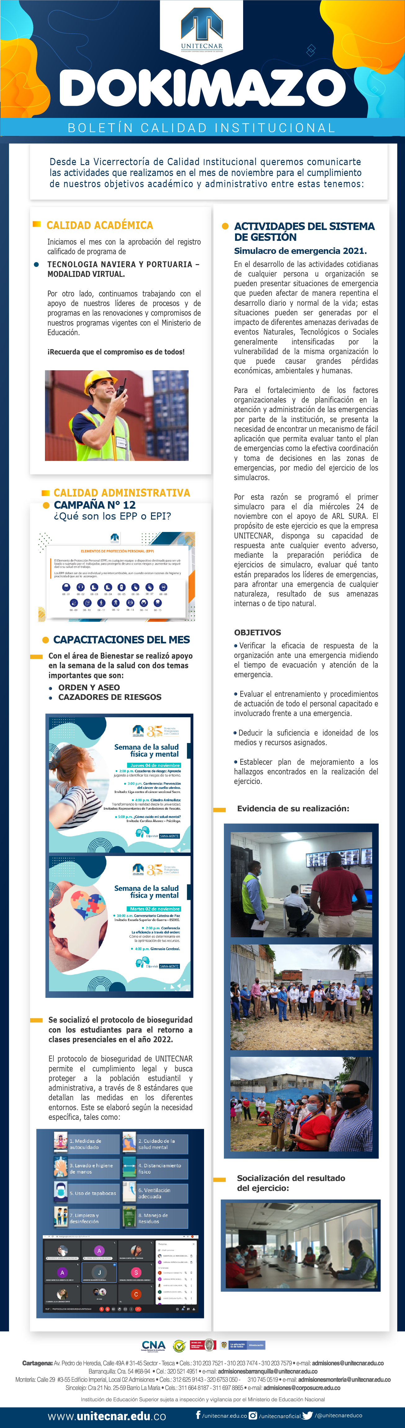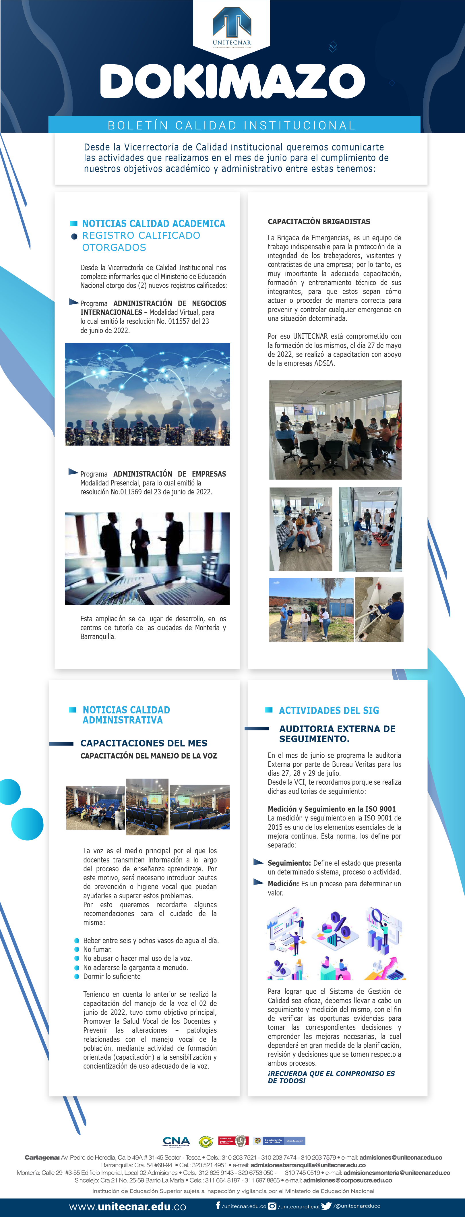 Con base a lo anterior Unitecnar cuenta con su plan de emergencia y brigadistas, los cuales, están capacitados y formados para atender la primera línea de la emergencia.