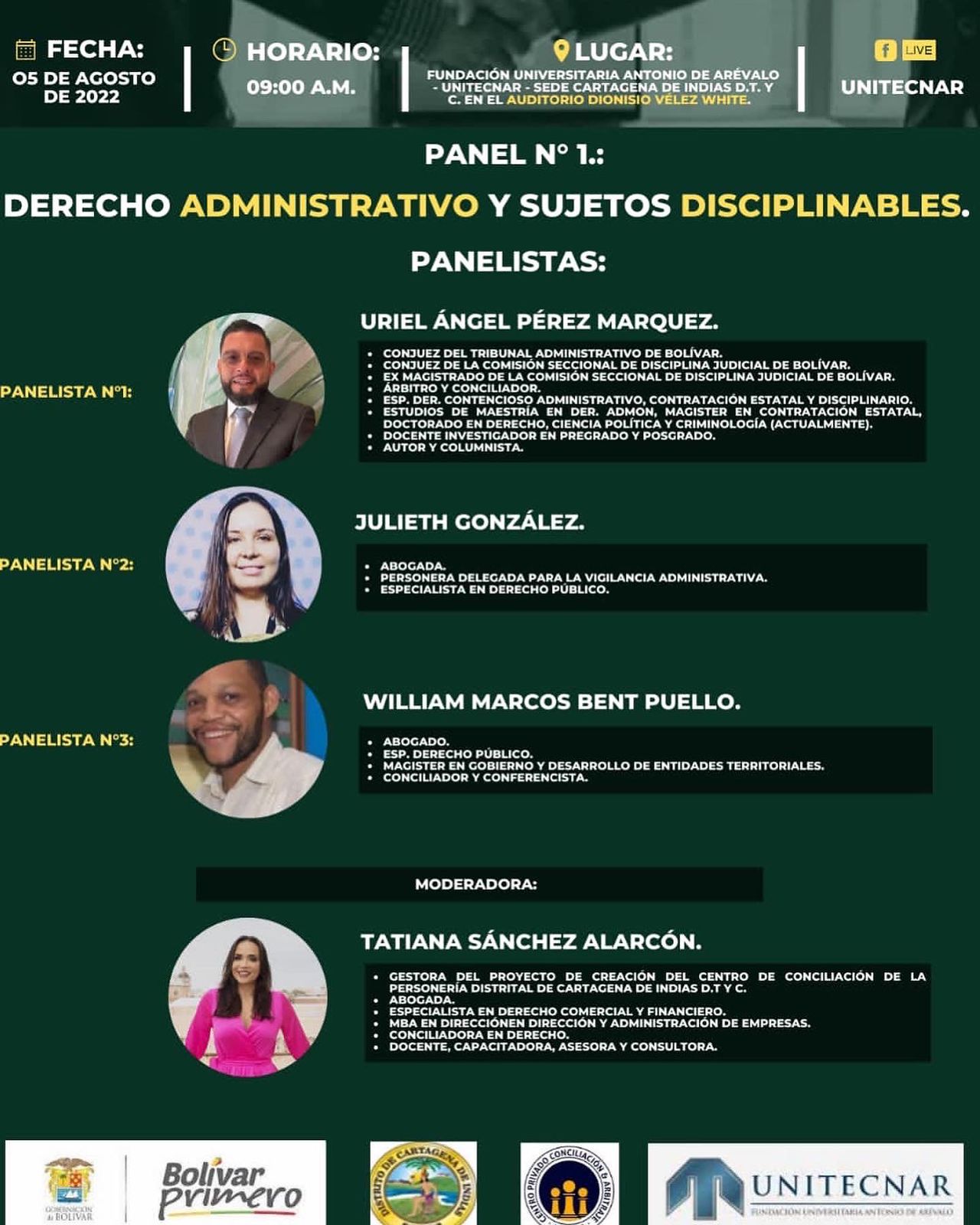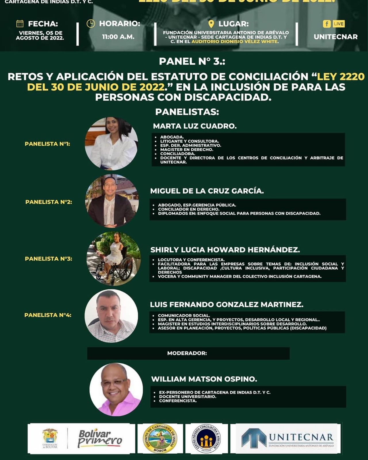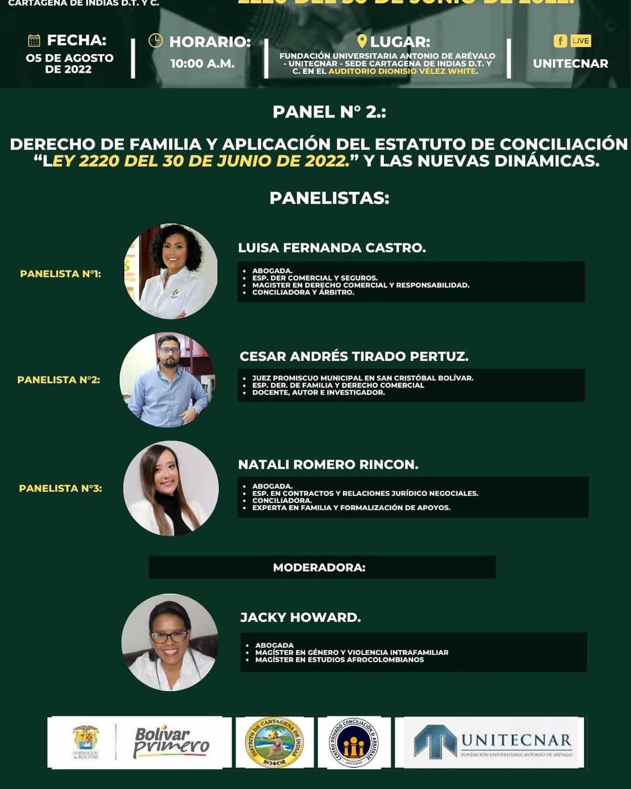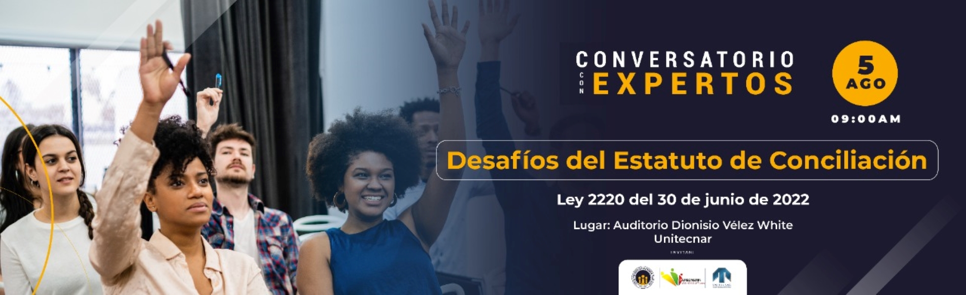 El conversatorio se realizará de manera híbrida en la modalidad virtual a través de la sala zoom Click Aquí y de manera presencial tendrá lugar en el Auditorio Dionisio Velez White de UNITECNAR el día viernes 5 de agosto de 2022 a la 9:00 a..m y contará con la presencia de importantes juristas locales y nacionales.